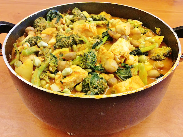 Temperei o refogado com sal, deixei ferver e juntei os ingredientes por esta ordem: batata em cubos, peixe, brócolos e castanhas (os dois juntos), favas e cogumelos (também juntos). A ordem em que devem juntar os alimentos depende dos próprios e da vossa preferência. Eu gosto dos brócolos e das castanhas durinhos, e se não for o vosso caso podem considerar colocar antes, por exemplo; e as favas que utilizei eram pré-cozidas, se as que usarem não forem precisarão de cozer durante mais tempo.