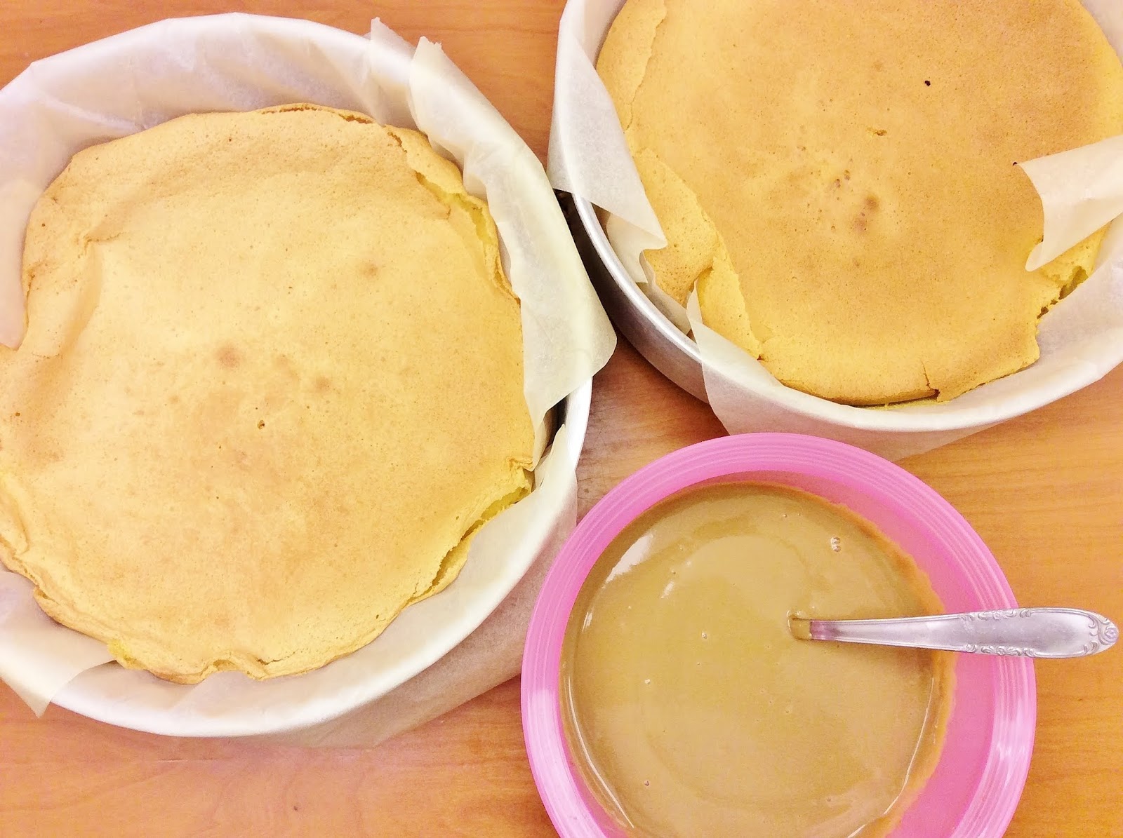 | Num recipiente grande, colocar os ovos, o açúcar e a manteiga e bater com uma batedeira elétrica até que o preparado esteja praticamente homogéneo (deve demorar 1 ou 2 minutos).