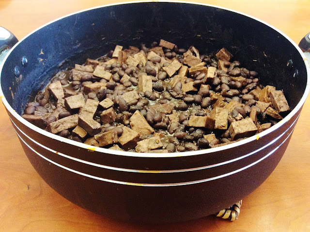 Devolvi ao lume, esperei que fervesse e juntei tofu fumado em cubos. Um pouco depois adicionei o feijão cozido e parte da água. Não adicionei sal porque tanto o tofu como o feijão estavam temperados. Depois foi só mexer de vez em quando e esperar que apurasse :)